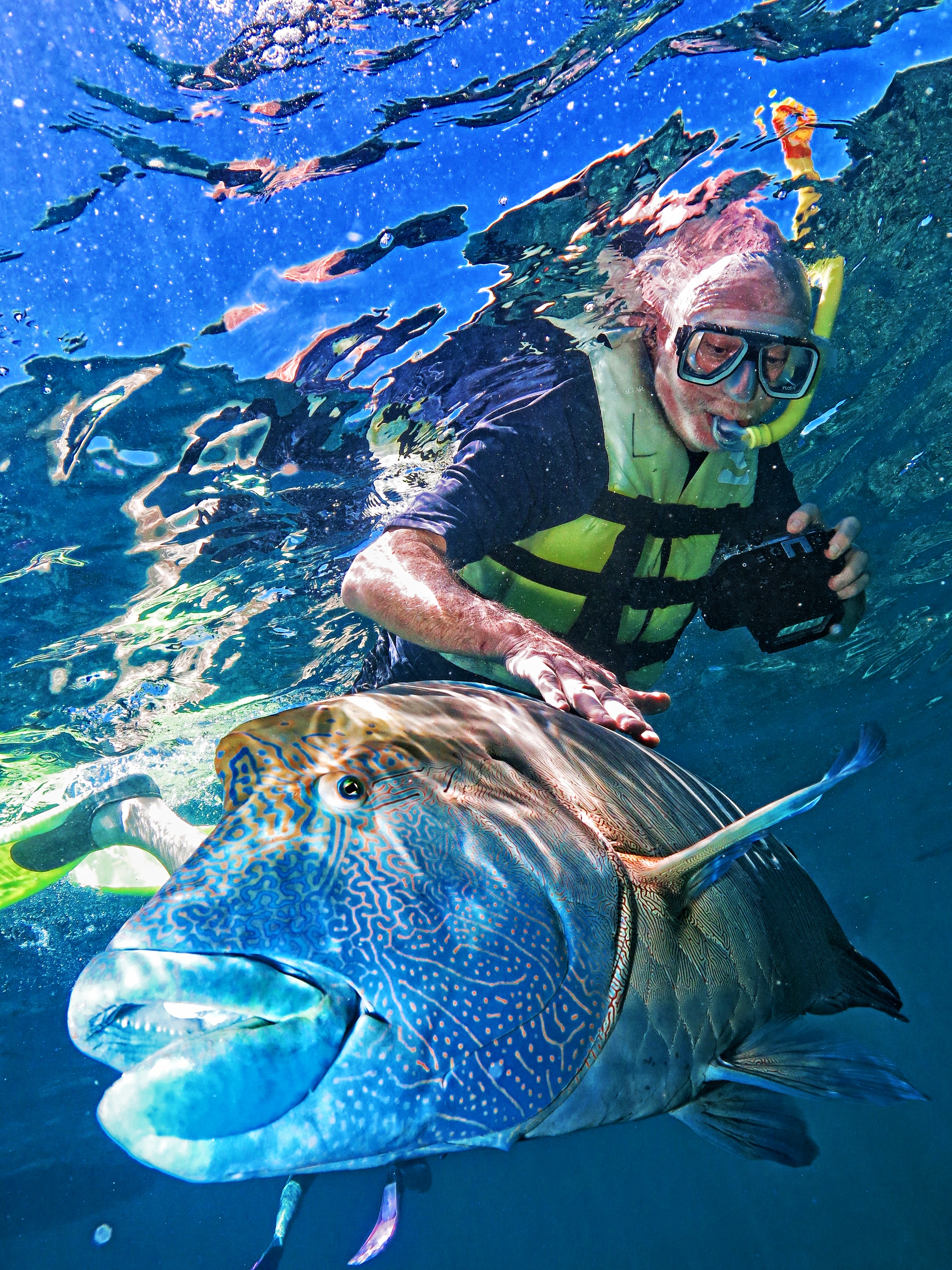This is the last week of summer vacation for schools in Australia as evidenced by the throngs of children (and their parents) vacationing at the Great Barrier Reef. Not to be outdone, the fish also took time off as very few schools were seen. But the custodian of the area checked me out to make sure the start of our Australian adventure would be remembered.