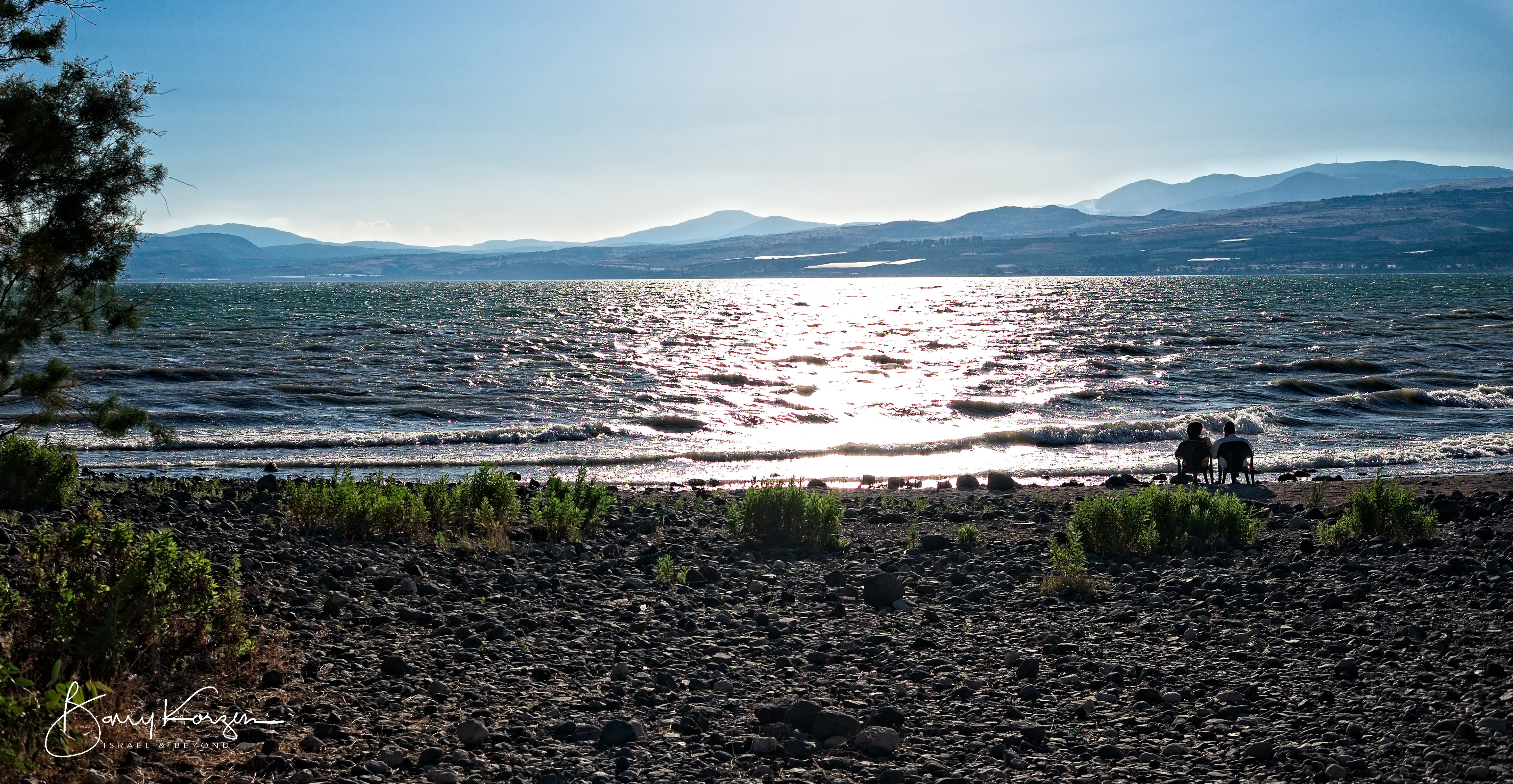 One hour before the onset of the Jewish Sabbath a couple contemplates the tranquility of a cloudless sky as they look westward across the Kinneret (Sea of Galilee) from the base of the Golan Heights. 50 years to the day war raged at this very spot with Syria attacking Israel from their well fortified bunkers. What a difference 50 years makes!